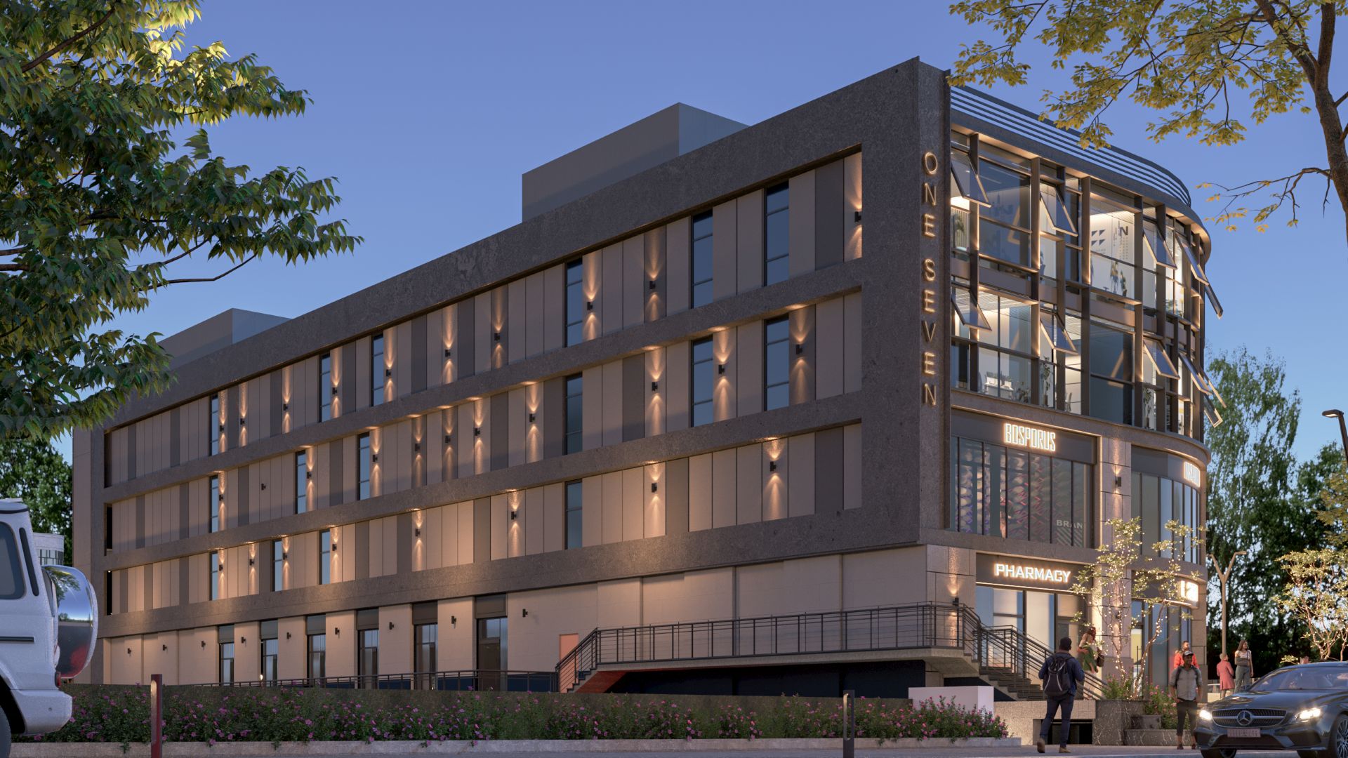 New facade identity aligned with surrounding commercial and administrative architecture.